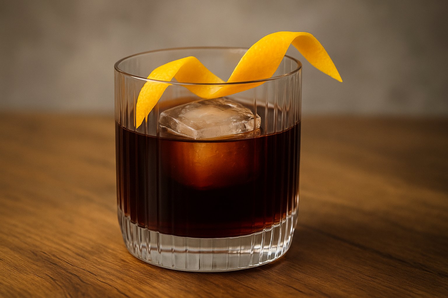 Alle Zutaten werden auf Eis gerührt – nicht geschüttelt – und anschließend in einen vorgekühlten Tumbler mit Eis abgeseiht. Mit einer Orangenzeste dekorieren.