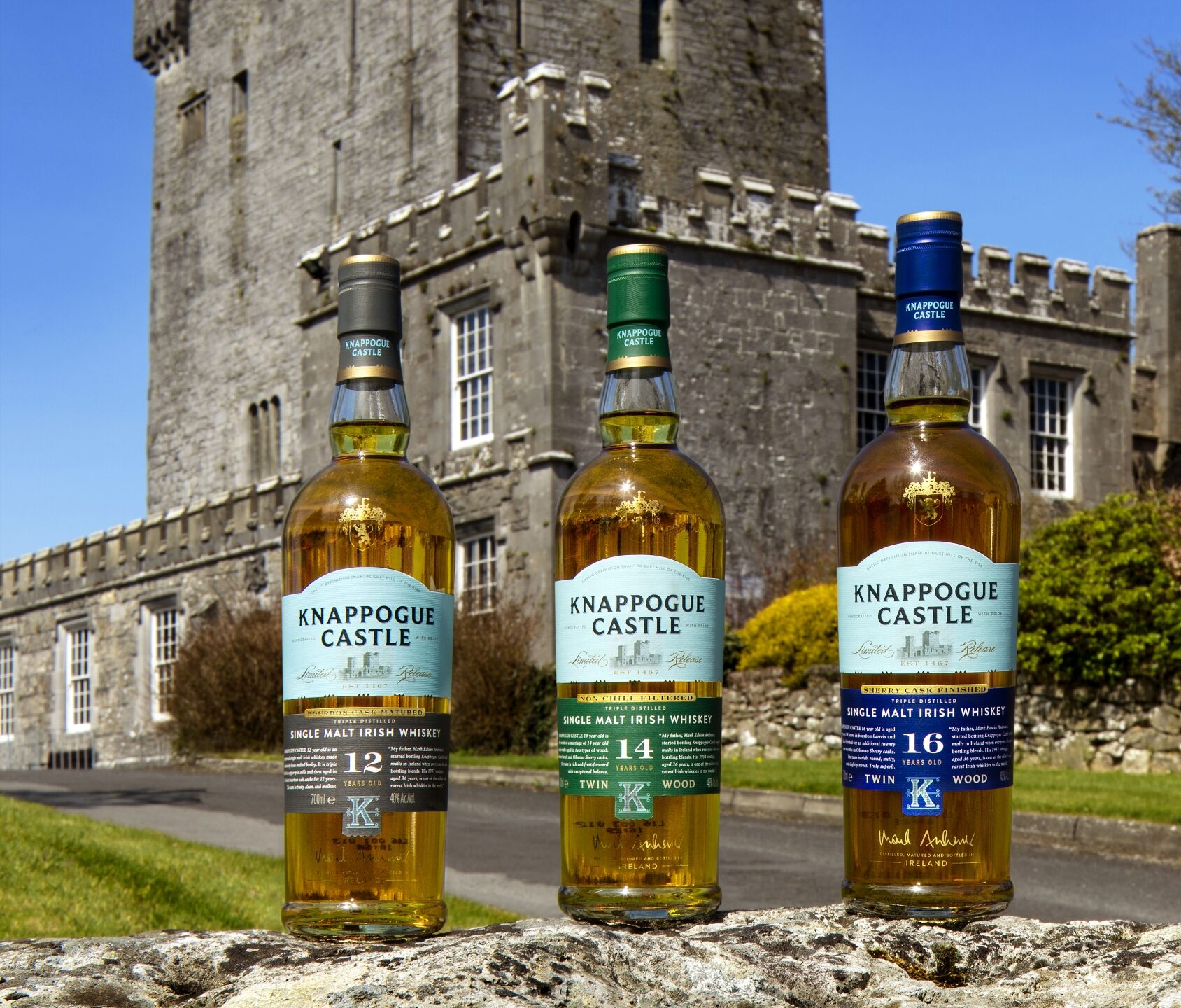 - Knappogue Castle bringt vier gereifte Single Malts auf den Markt, beginnend mit einem 12 Jahre alten Single Malt.