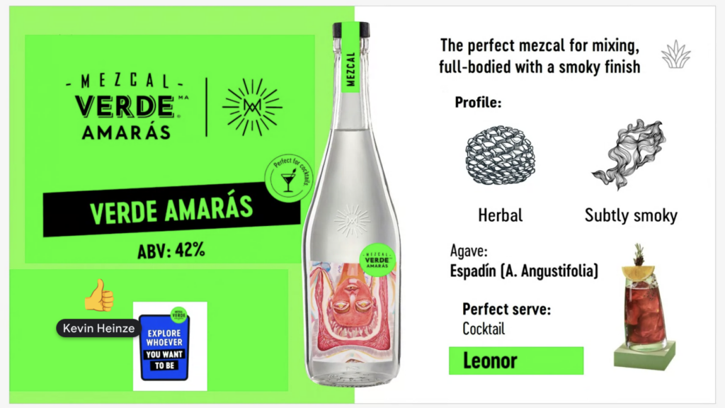 Verde ist bewusst so komponiert, dass der Rauch erst im Nachhall erscheint. Er übersättigt den Gaumen nicht mit Rauch, sondern lädt zum Entdecken ein. Ziel ist es, eine positive erste Mezcal-Erfahrung zu schaffen.