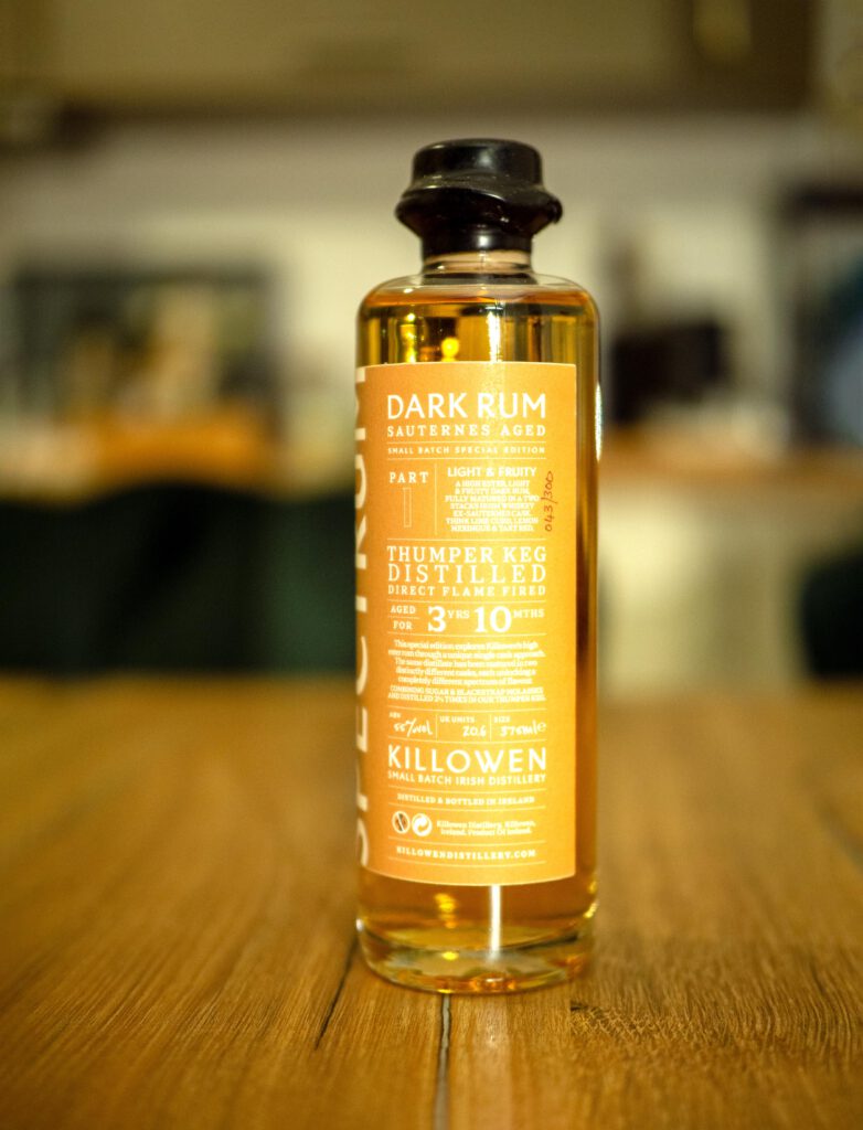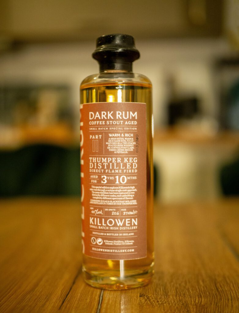 Killowen nutzt für ihren Rum eine Mischung aus 50 % schwarzer Melasse (Blackstrap Molasses) und 50 % Zucker (oder zumindest eine Melasse-/Zuckerbasis). Destilliert wird mit zwei handgefertigten, direkt befeuerten Kupfer-Pot Stills portugiesischer Bauart, getauft auf Criostóir (1.000 l) und Broc (800 l) mit Wormtubs. Laut Hersteller wird der Rum 2,5 mal destilliert. Über die Fermentationsdauer konnte ich keine Informationen finden.